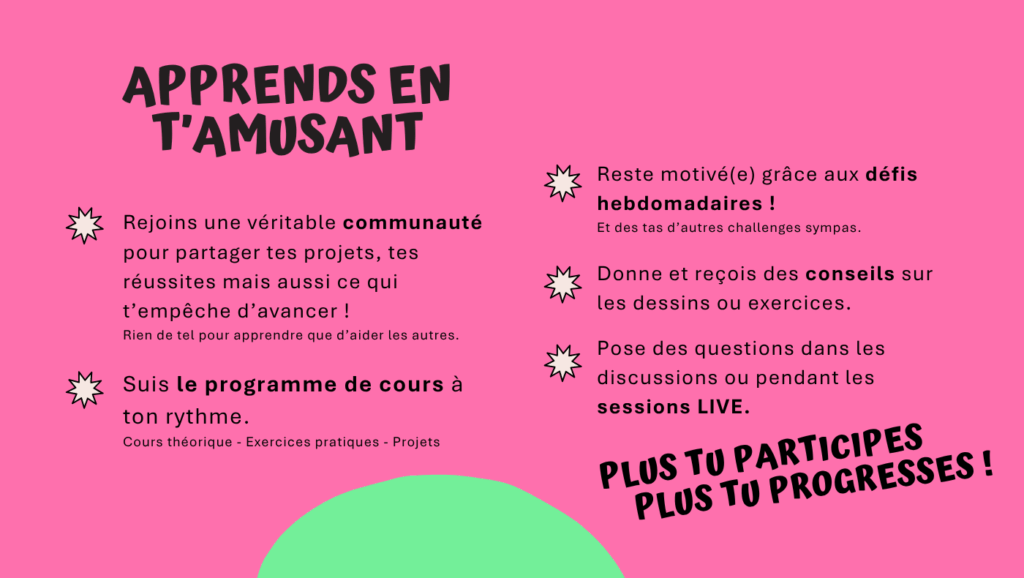 L’effet de groupe, c’est LE moteur de la motivation. On peut enfin arrêter de dessiner seul dans son coin et partager son travail avec des personnes qui vont le voir et que ça intéresse vraiment !