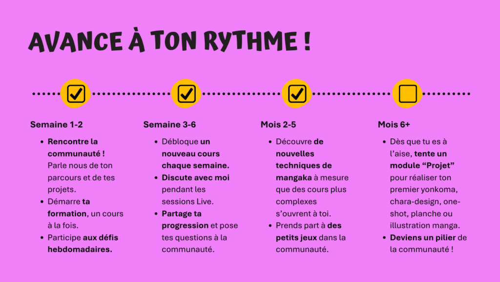 L’Académie est conçue comme une école de manga nouvelle génération. L’objectif ? Vous faire progresser, vous motiver, et vous donner une méthodologie claire, quelle que soit votre expérience actuelle.