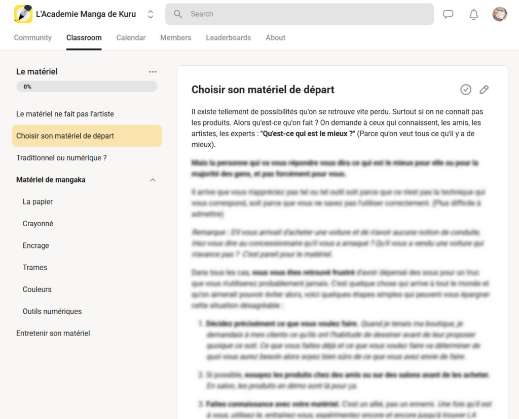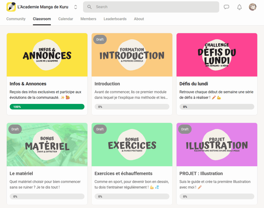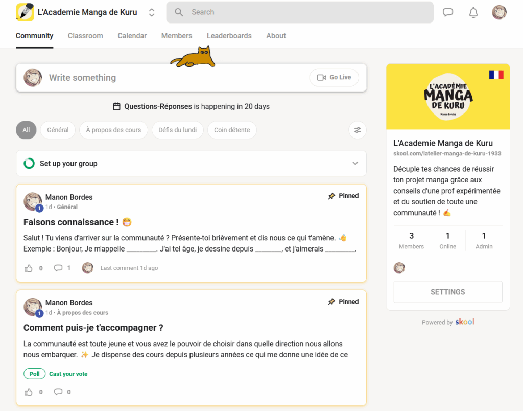 Depuis plusieurs années, l’Atelier Manga de Kuru est devenu un lieu à part : un endroit convivial où les élèves apprennent en s’amusant, progressent, s’encouragent, se dépassent et vivent l’apprentissage du dessin comme une aventure collective. Mais j’ai remarqué qu’une fois rentrés à la maison, pour la plupart, tout s’arrête… et c’est précisément ce qui m’a poussée à repenser mon offre de cours actuelle jusqu’à ce que je découvre Skool.