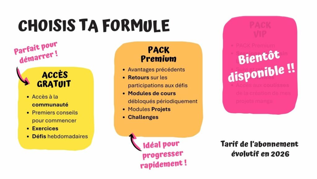 Pour les membres Premium, je mets à disposition un programme structuré issu de mon expérience d’enseignante et d’autrice, de mes collaborations avec des mangakas et de ma formation auprès d’une mangaka japonaise : Koko Sensei.