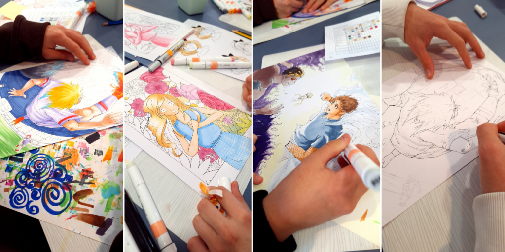 En groupe, on construit un scénario, on réalise un storyboard, puis chacun dessine une ou deux planches. Toutes les pages sont mises bout à bout pour former une vraie mini-BD collective. Encrage, trames, narration manga : un programme complet.
